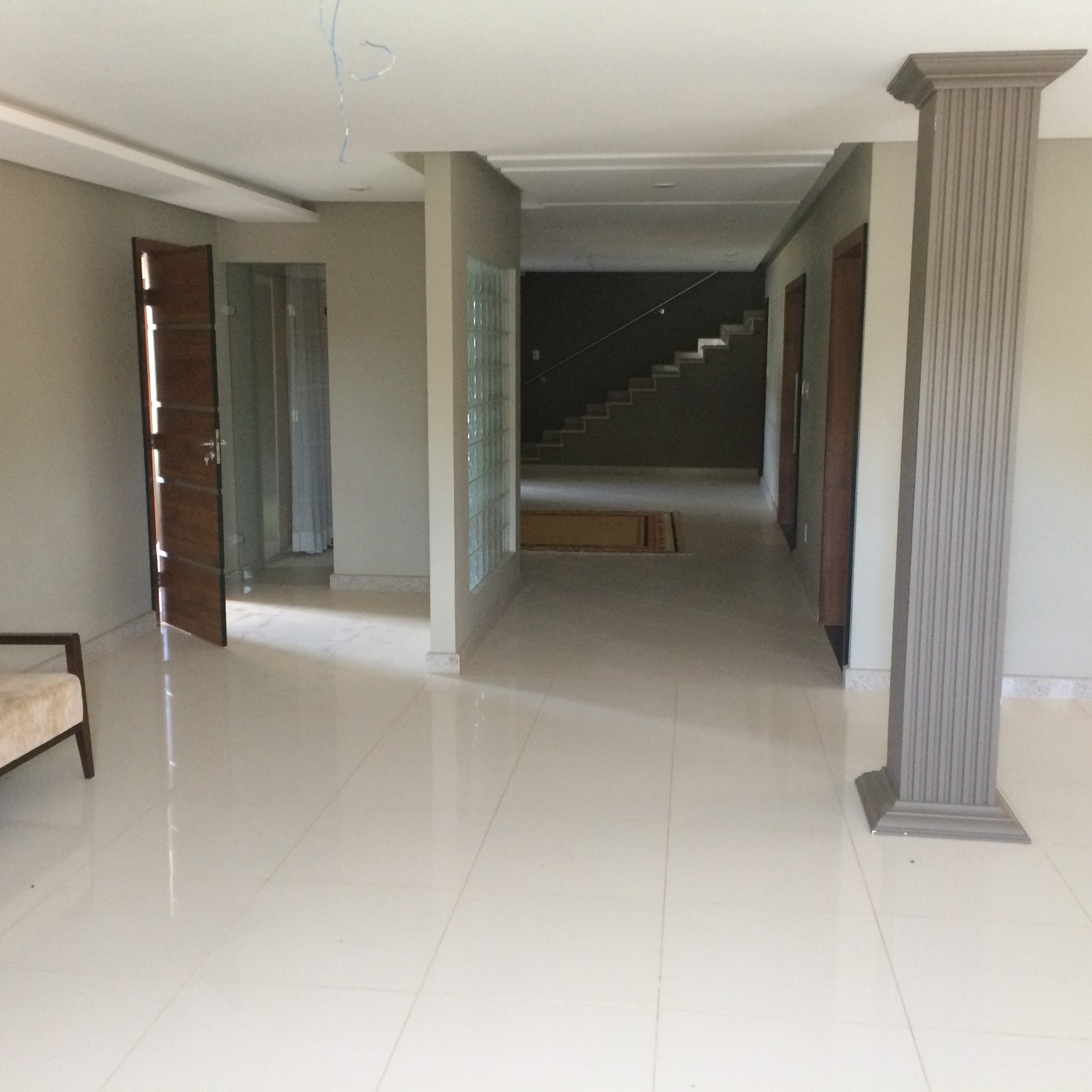 PRIMEIRO PAVIMENTO : três hall, uma sala de estar com 67,80m², uma sala de jantar com 35,40m², uma sala de tv com 37m², um lavabo, um banheiro social, uma cozinha com 15,40m², uma despensa, uma área de serviço com 8,40m² e uma escada de acesso ao segundo pavimento. Medindo 243,50m².