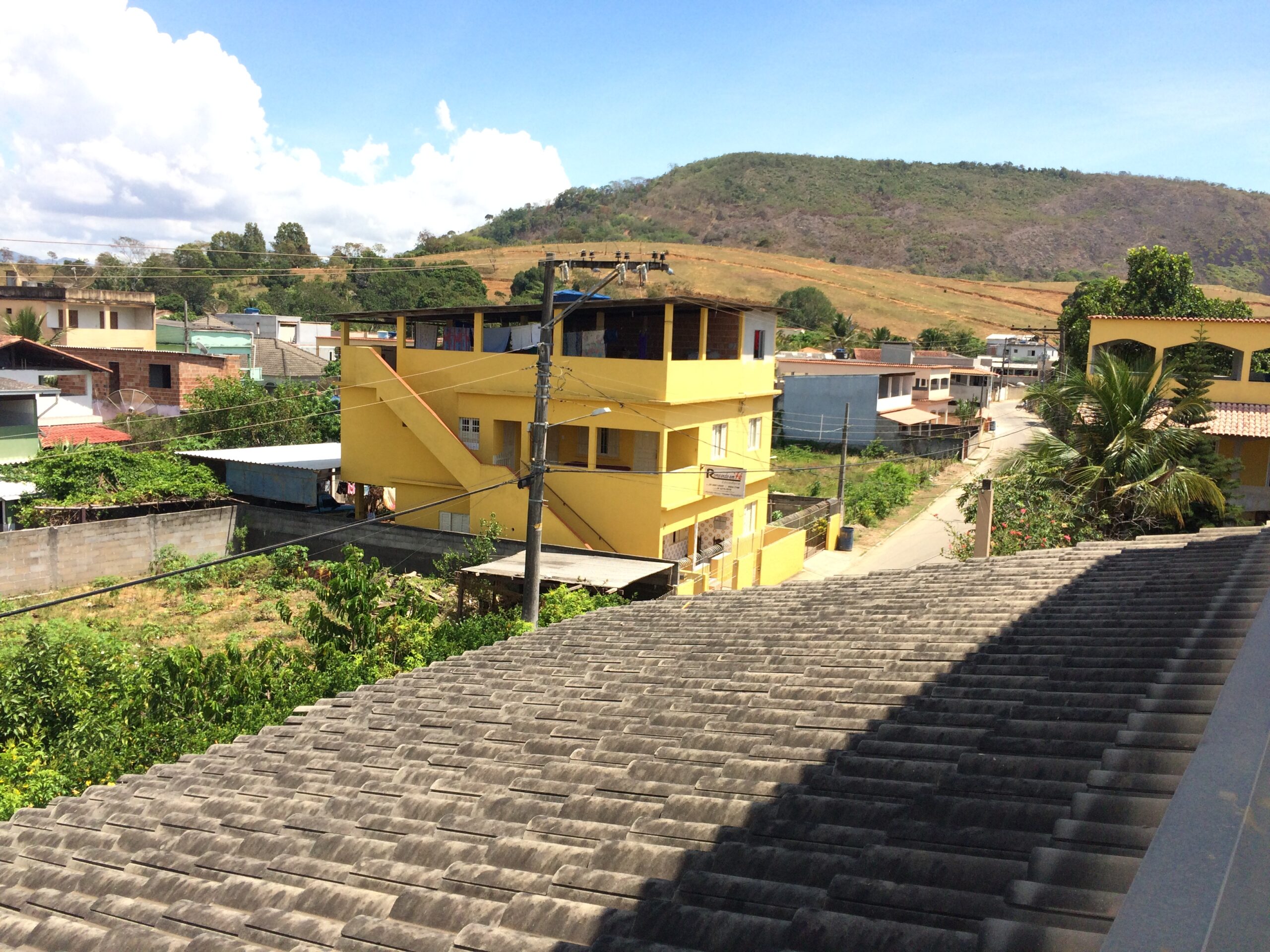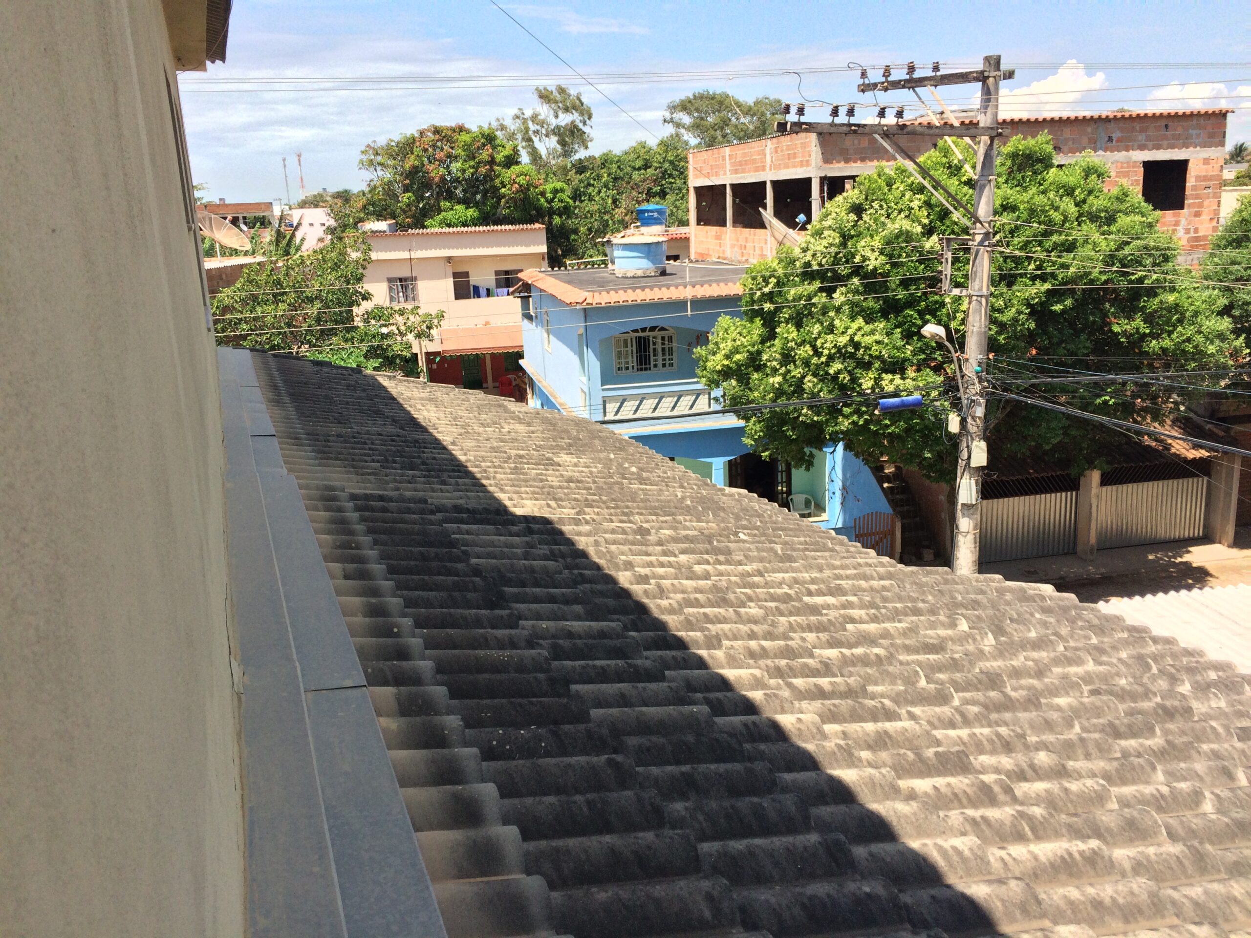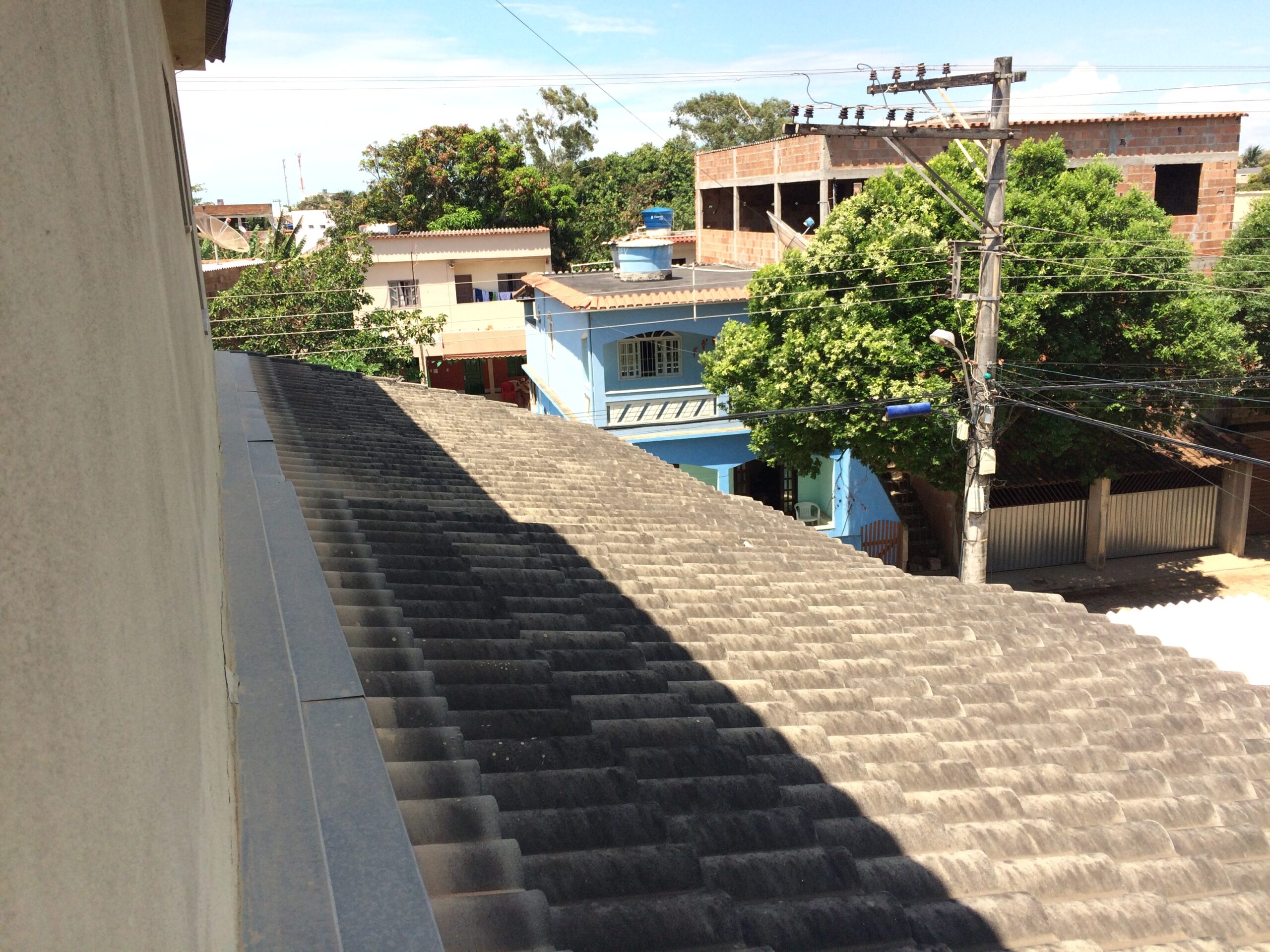 – Telhado colonial com madeira de lei e telhas de concreto tégula.