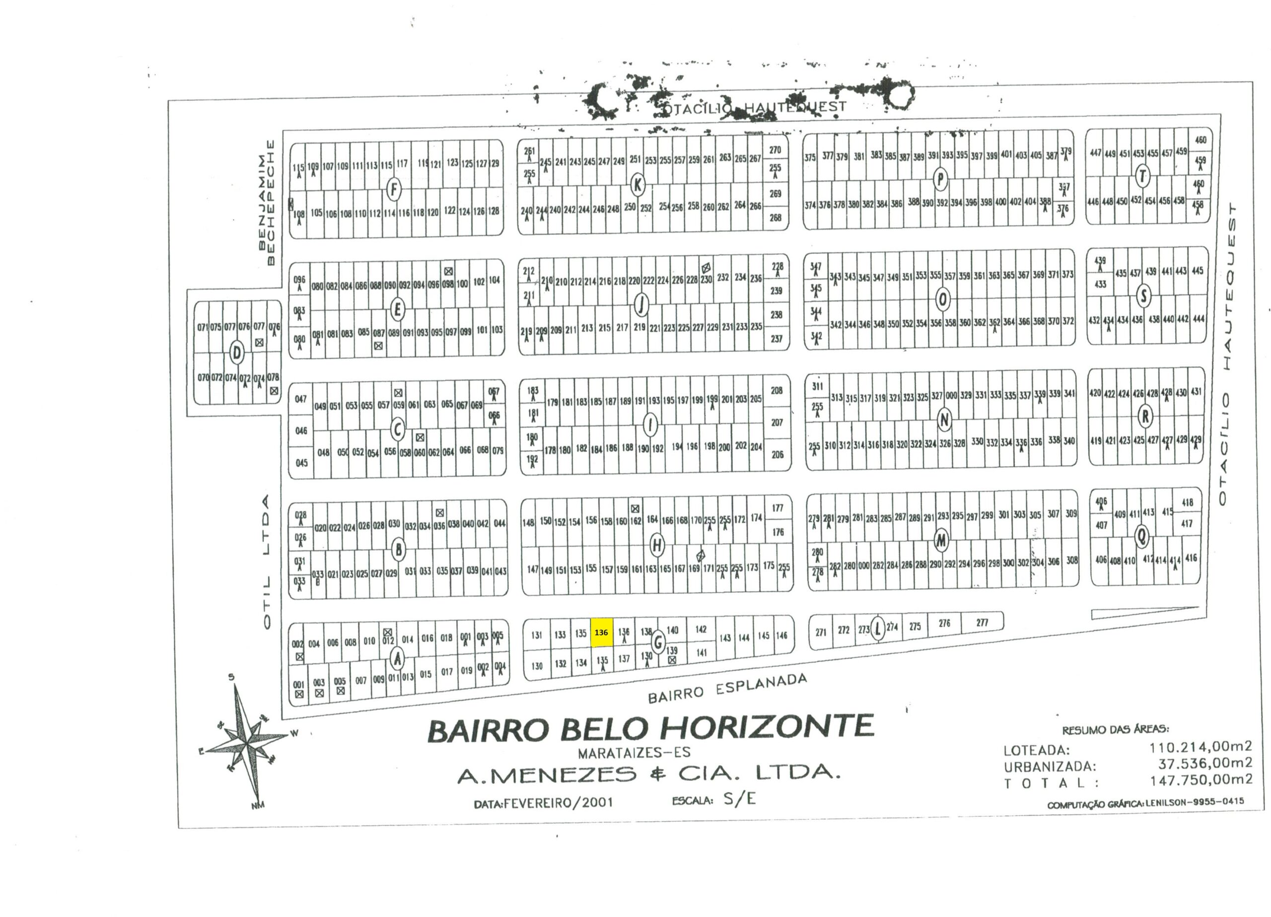 Um lote de terreno número 137 da quadra G do bairro Belo Horizonte, na praia de Marataízes – ES. Medindo vinte (20,00) metros de frente, igual medida nos fundos, doze (12,00) metros nas laterais esquerda e direita, totalizando 240,00 m², confrontando-se frente com a Rua Joaquim Candal Ribeiro, fundos com o Lote 136-A, lateral direita com o lote 135-A, lateral esquerda com o lote 130-A, tudo de conformidade com a planta devidamente aprovada pela municipalidade, objeto da inscrição municipal número 01.01.491.0129.001, matriculado no Registro Geral de Imóveis sob o número 1.637 de ordem, em 18/05/1977.