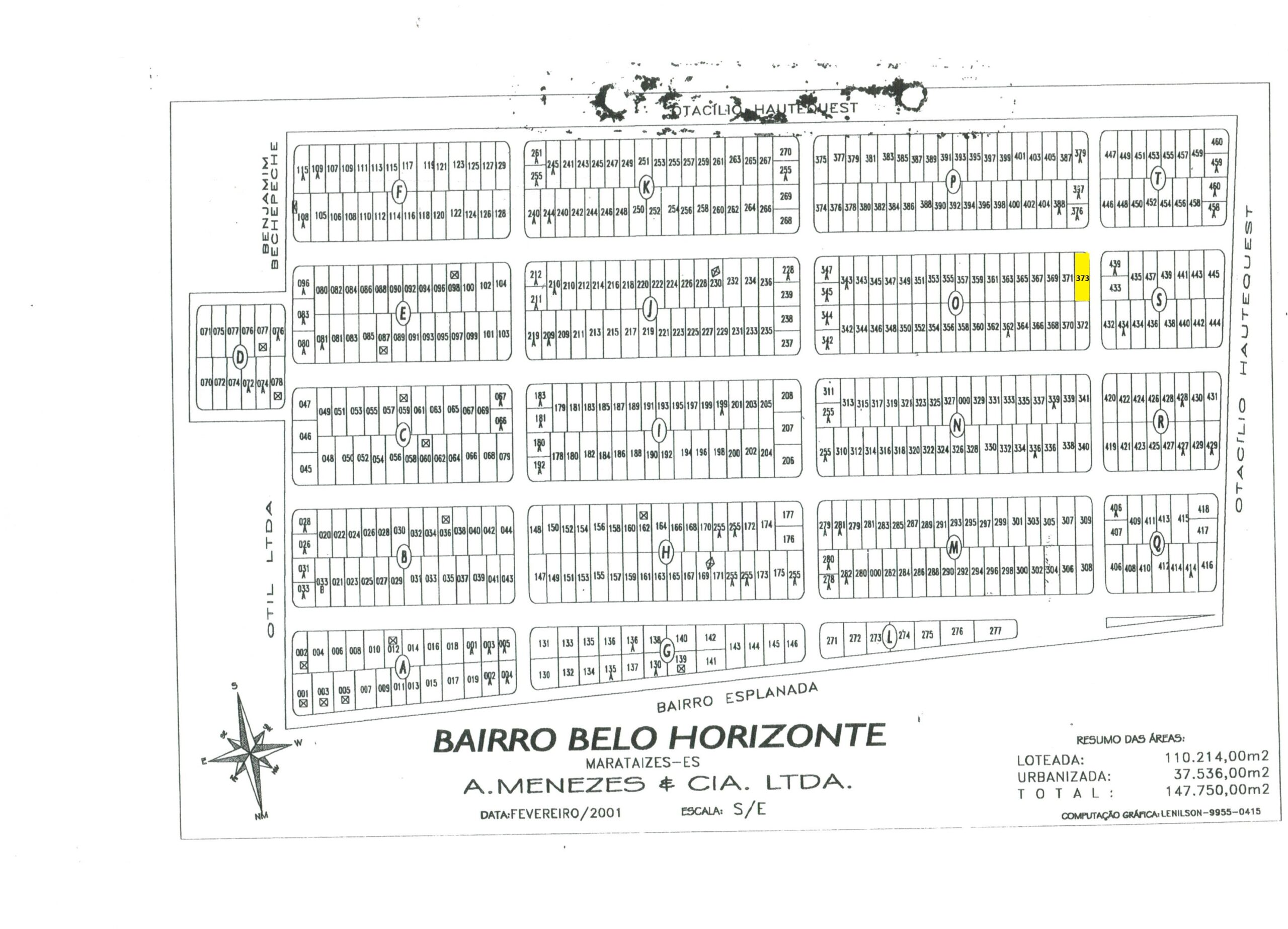 Um lote de terreno sob o número 373 da quadra O do bairro Belo Horizonte, na praia de Marataízes – ES. Medindo dez (10,00) metros de frente, igual medida nos fundos, e vinte (20,00) metros nas laterais esquerda e direita, totalizando 200,00 m², confrontando-se frente com a Rua Projetada, fundos com o Lote 372, lateral direita com o lote 371, lateral esquerda com a Rua Projetada, tudo de conformidade com a planta devidamente aprovada pela municipalidade, objeto da inscrição municipal número 01.01.502.0413.001.