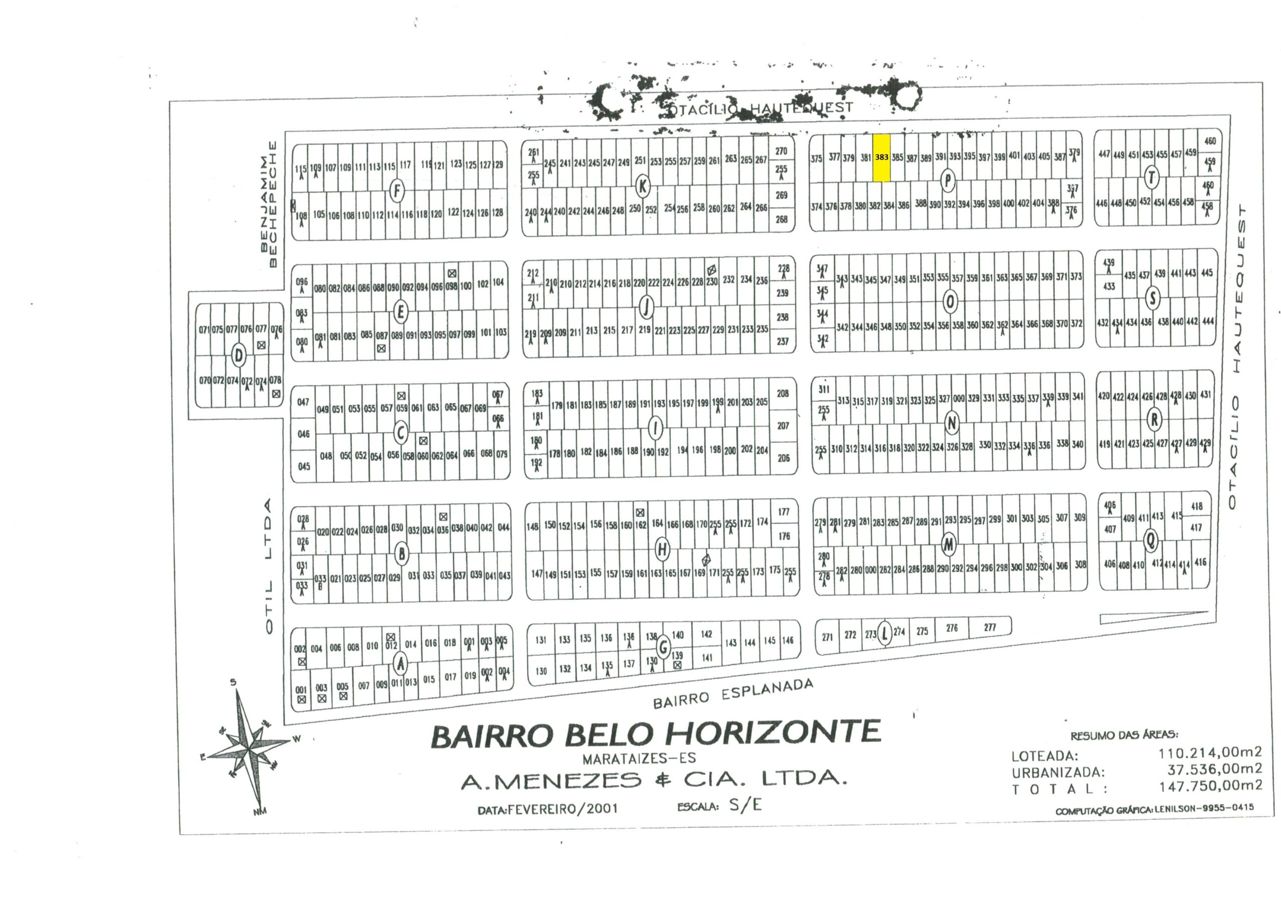 Um lote de terreno número 383 da quadra P do bairro Belo Horizonte, na praia de Marataízes – ES. Medindo doze (12,00) metros de frente, igual medida nos fundos, por vinte (20,00) metros nas laterais esquerda e direita, totalizando 240,00 m², confrontando-se frente com a Rua Nacib Antonio Marvila, fundos com o Lote 382, lateral direita com o lote 381, lateral esquerda com o lote 385, tudo de conformidade com a planta devidamente aprovada pela municipalidade, objeto da inscrição municipal número 01.01.508.0282.001.
